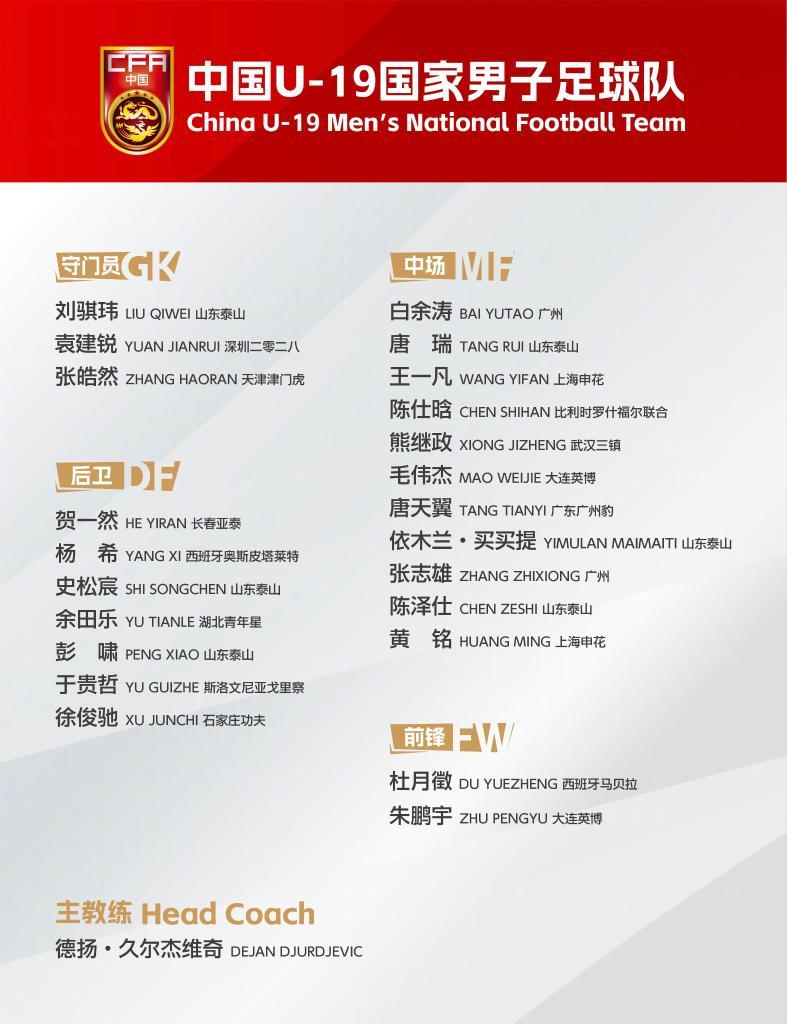 中國U19男足主教練是久爾杰維奇,共有23名球員參加此次集訓,其中來自山東泰山俱樂部的球員最多,有史松宸、彭嘯、陳澤仕等6人。
