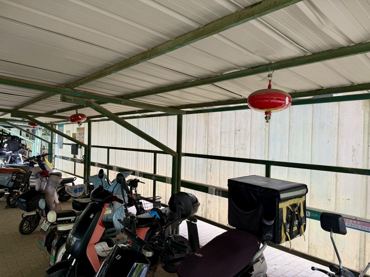 青和居小區電動車棚配備了懸掛式溫感滅火器。人民網記者 周恬攝