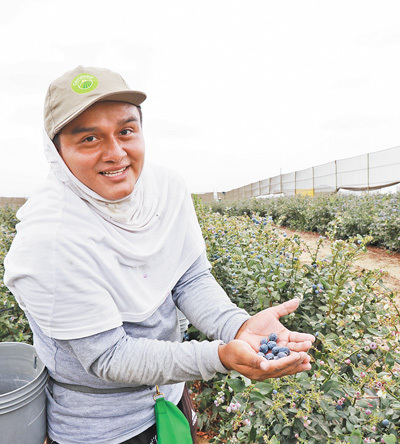 在秘魯特魯希略市一家農(nóng)場(chǎng)里,一名采摘工人在展示他剛摘下的藍(lán)莓。 本報(bào)記者 顏 歡攝 |