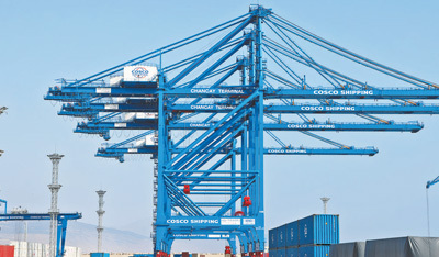 秘魯錢凱港,排列整齊的藍(lán)色岸橋正繁忙運(yùn)作。 本報(bào)記者 顏 歡攝 |