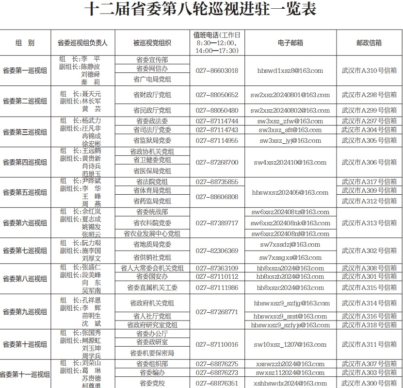 據(jù)悉,本輪巡視工作時間2個月左右,其間設(shè)立專門值班電話、郵政信箱、電子郵箱和“荊楚碼上巡”信訪反映二維碼,主要受理反映被巡視黨組織領(lǐng)導(dǎo)班子及其成員、下一級主要負責(zé)人和重要崗位領(lǐng)導(dǎo)干部問題的來信、來電,重點是關(guān)于違反政治紀律、組織紀律、廉潔紀律、群眾紀律、工作紀律和生活紀律等方面的問題反映。巡視組受理信訪時間截止到2024年12月29日。