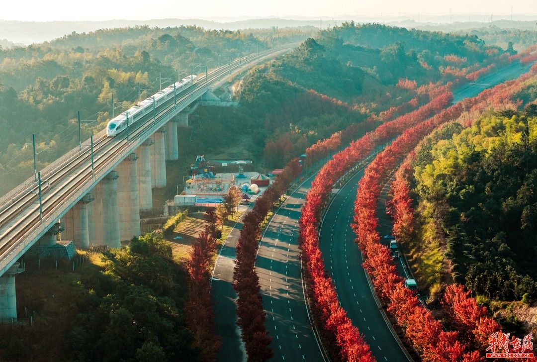 益陽魚形山東路的“紅楓大道”迎來一年最美季節,近6000棵北美紅楓換上紅裝,宛若一團團火焰,沿著山勢蜿蜒起伏直到盡頭。“紅楓大道”全長6.8公里,是魚形湖風景區核心景觀之一,這里的楓葉觀賞期可以持續到11月中旬。站在“紅楓大道”路邊,找好角度,隨意按下快門便是一張夢幻美景照。