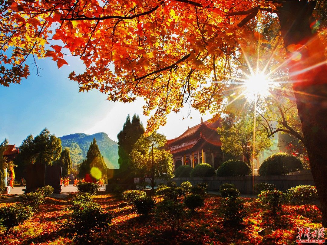 雖已立冬,但九嶷山舜帝陵秋意正濃。火紅的楓葉與紅墻黛瓦、參天古樹交相輝映,滿目色彩斑斕。舜帝陵是我國有史以來帝陵中最古老的陵,也是寧遠縣旅游景區最佳的賞紅葉地之一,每年紅葉最佳觀賞期為11月初至12月中旬。游覽完舜帝陵,游客還可以前往三分石景點,感受大自然的鬼斧神工。