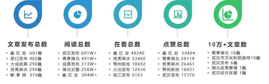 從單項指數看,文章發布總數、閱讀總數、點贊總數等指數整體下降趨勢明顯。在TOP100榜單中,七成賬號文章發布總數下降,單項排名前三的賬號依次為“最紅安”“硚口發布”“大成武昌”;超六成賬號文章閱讀總數下降,單項排名前三的賬號依次為“武漢發布”“青春湖北”“宜昌發布”;超六成賬號文章點贊總數下降,單項排名前三的賬號依次為“最紅安”“青春湖北”“秀美浠水”。
