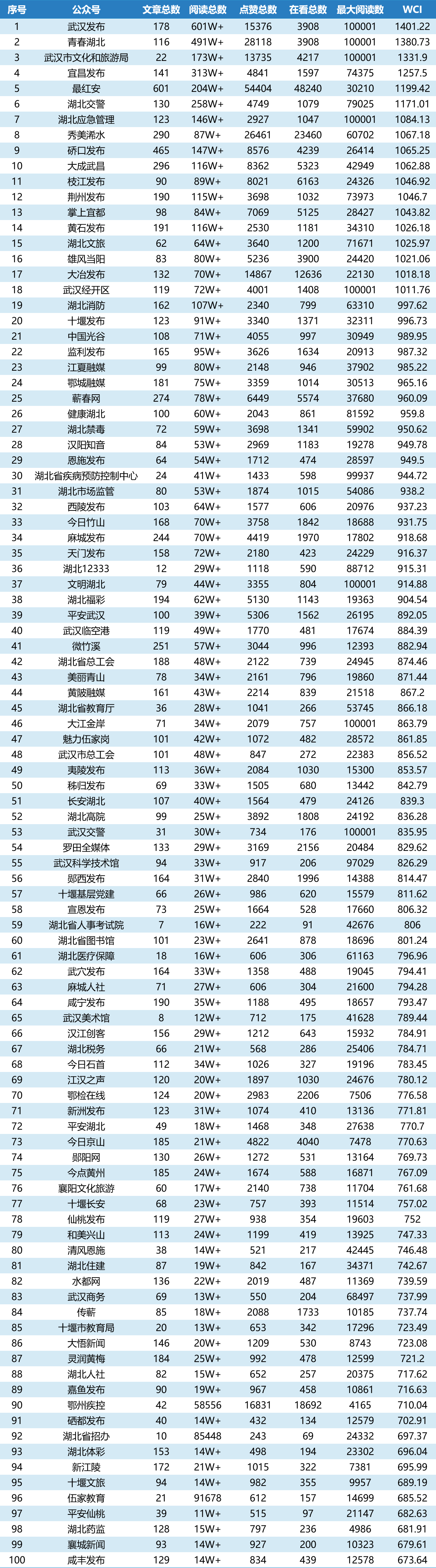 1、聚集湖北省內主要黨政機關政務微信公眾號,根據WCI指數數據進行科學排行,主要從“整體傳播力”“篇均傳播力”“頭條傳播力”“峰值傳播力”四個維度進行評價。