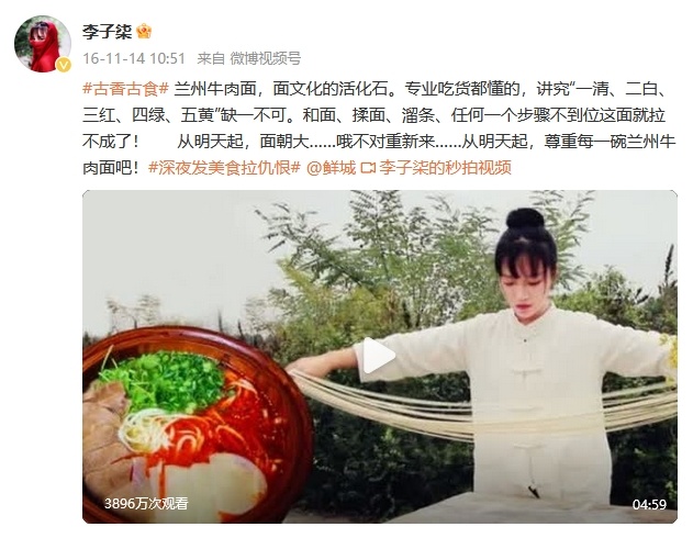 2015年,李子柒開始拍攝美食主題的短視頻。2016年11月,李子柒迎來自己的第一個爆款短視頻《蘭州牛肉面》,開始走紅。隨著人氣暴漲,源源不斷的工作邀約涌向了李子柒,當時每天都有幾十個廣告商找上她。