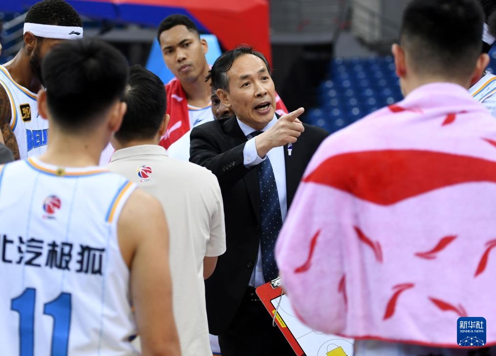 11月12日,北京北汽隊主教練許利民(中)在比賽間隙向隊員布置戰術。新華社記者 李紫恒 攝