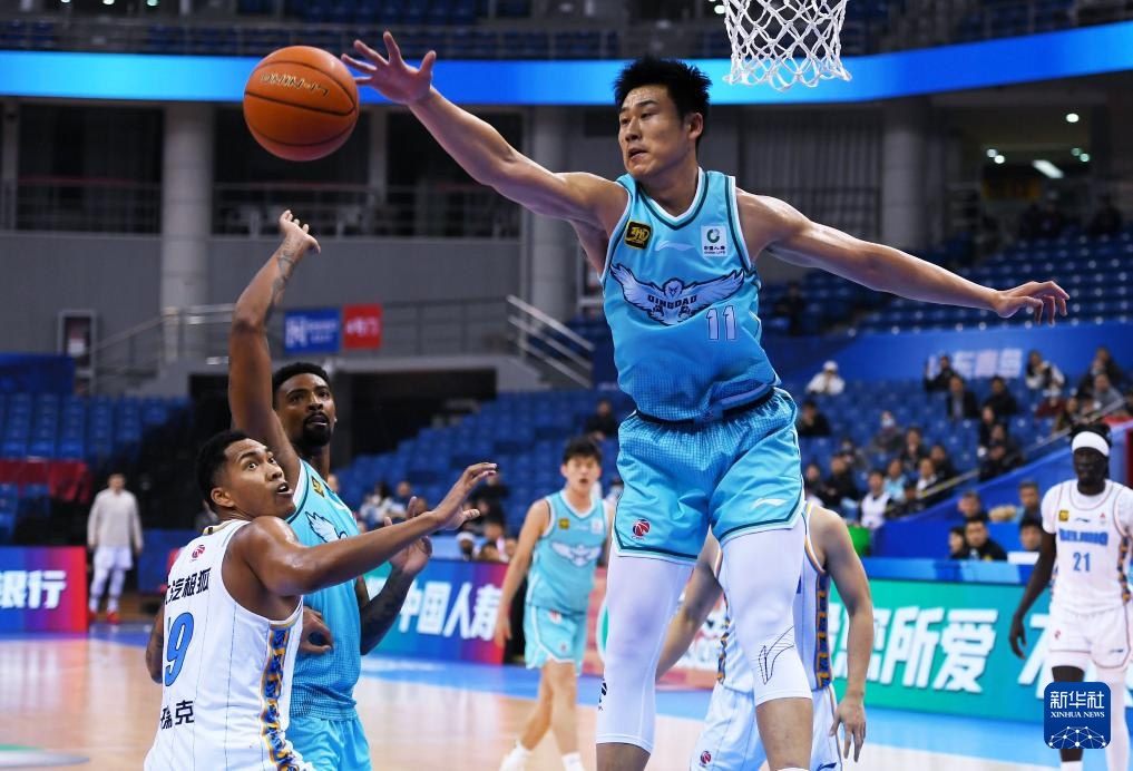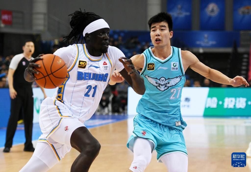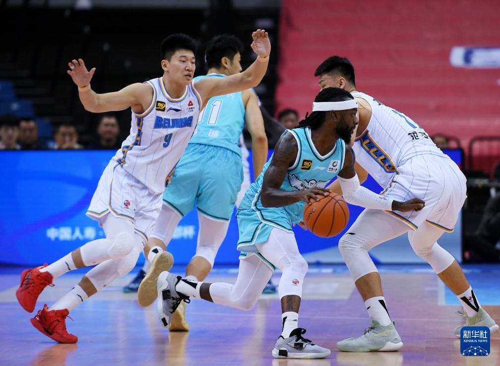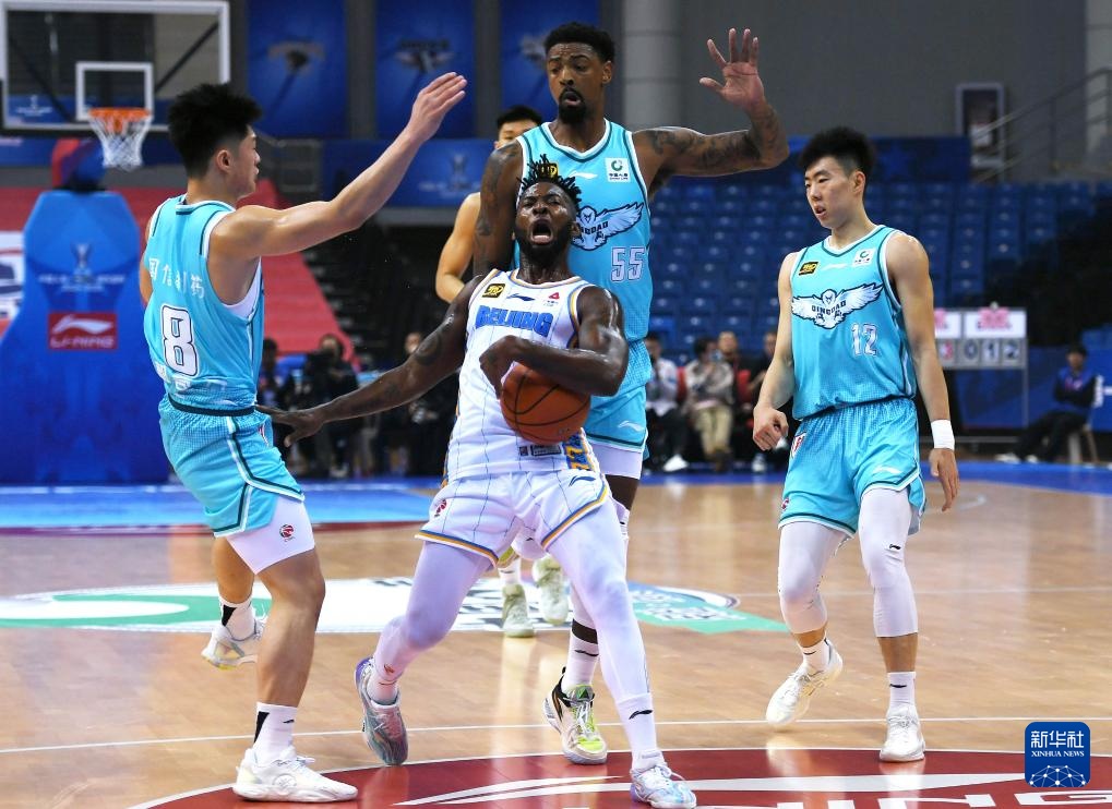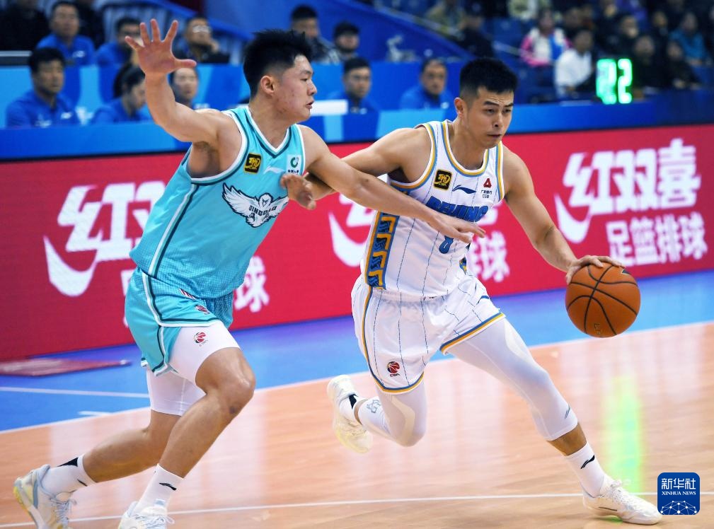 11月12日,青島國信制藥隊球員賈誠(前右)在比賽中防守北京北汽隊球員塔瑞克(左一)。新華社記者 李紫恒 攝