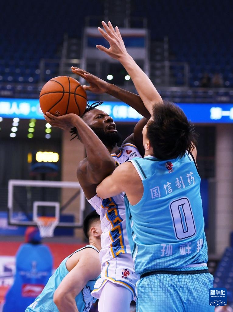 11月12日,青島國信制藥隊球員孫祥翔(右)在比賽中防守北京北汽隊球員杰曼投籃。新華社記者 李紫恒 攝