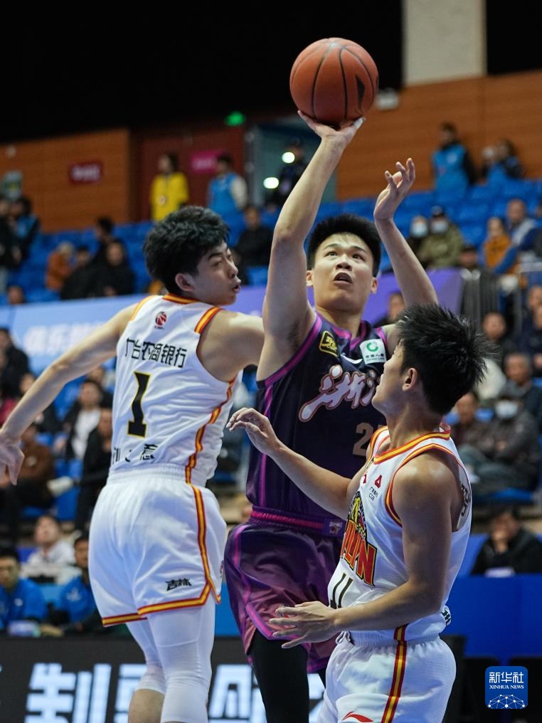 11月13日,浙江稠州金租隊(duì)球員王仔路(中)在比賽中投籃。新華社記者 朱崢 攝