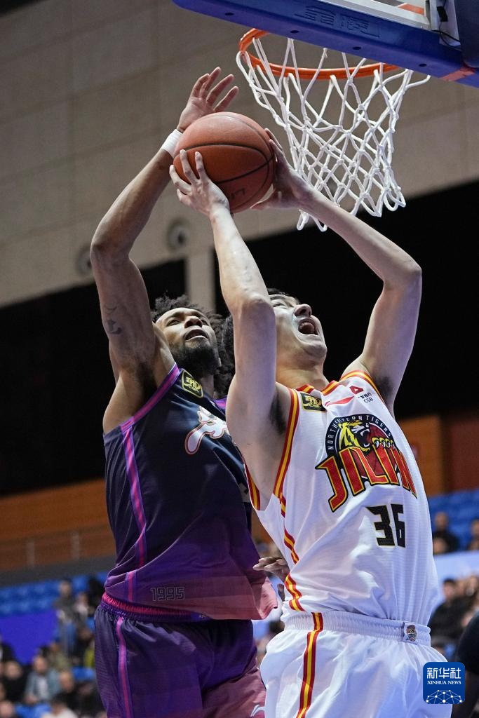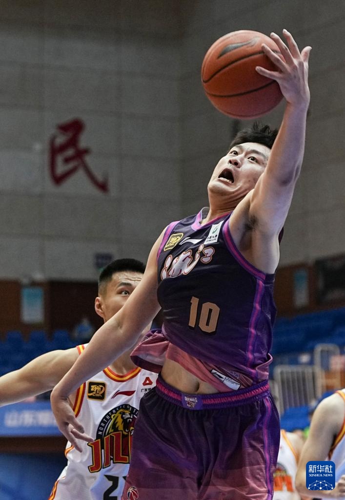 11月13日,吉林九臺農(nóng)商銀行隊(duì)球員趙嘉浩(右)在比賽中上籃。新華社記者 朱崢 攝