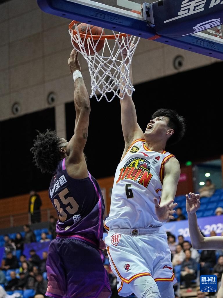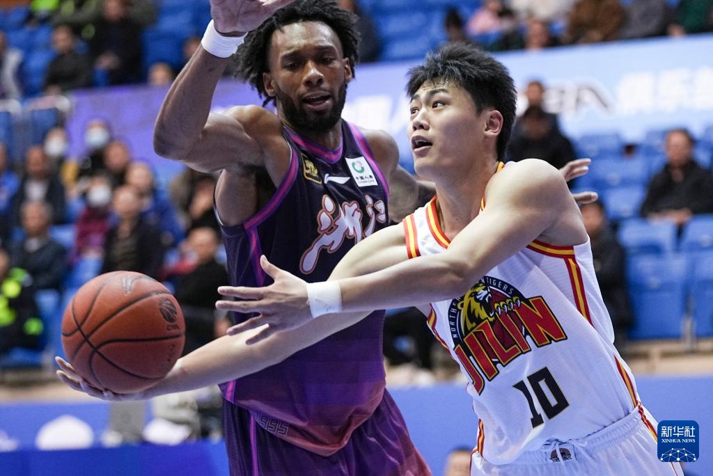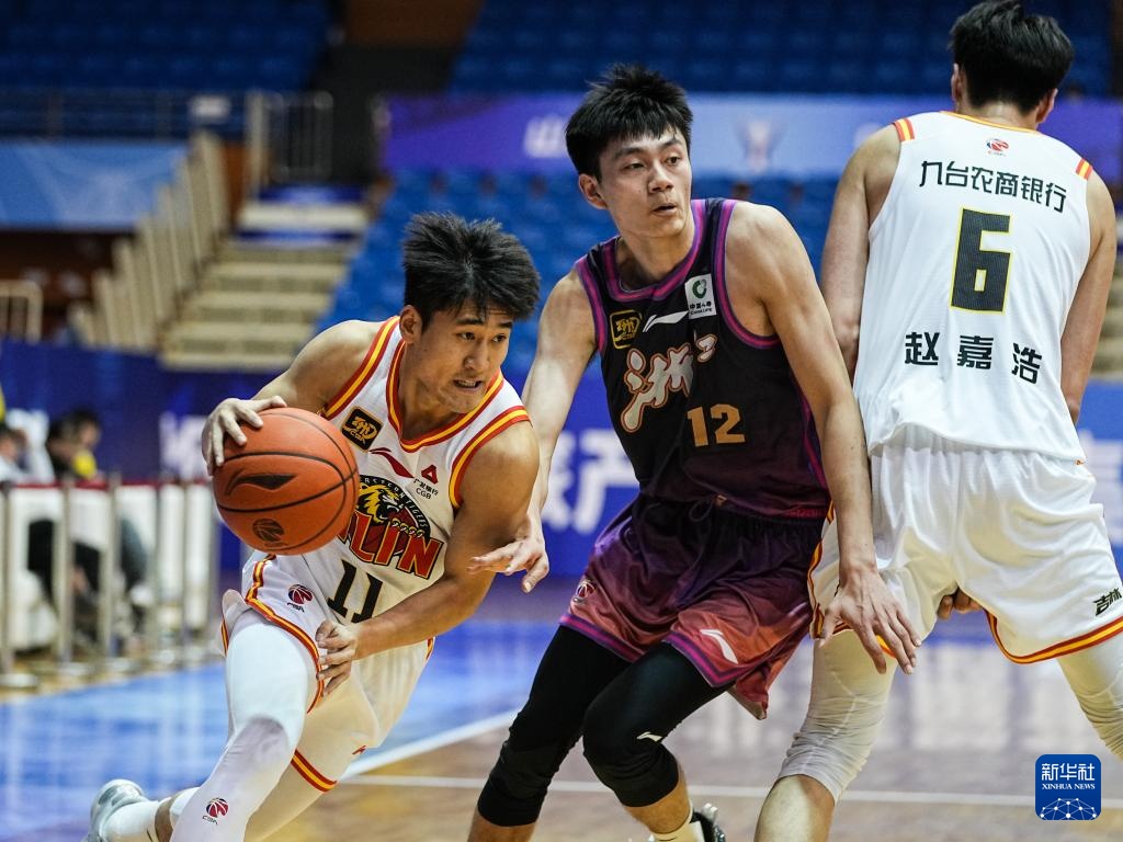 11月13日,吉林九臺農(nóng)商銀行隊(duì)球員姜偉澤(左)在比賽中帶球突破。新華社記者 朱崢 攝