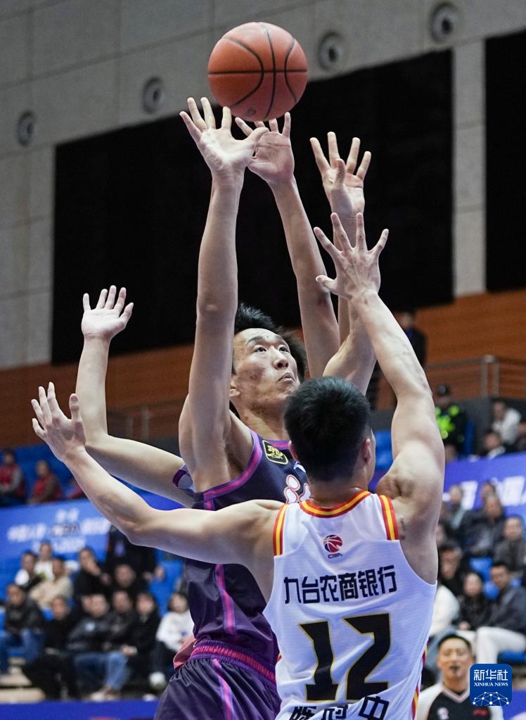 11月13日,吉林九臺農(nóng)商銀行隊(duì)球員代懷博(右)在比賽中進(jìn)攻受阻。新華社記者 朱崢 攝