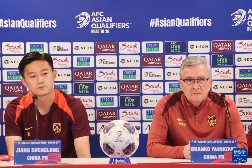 11月13日,中國隊主教練伊萬科維奇(右)和球員蔣圣龍出席新聞發布會。新華社記者 王海洲 攝