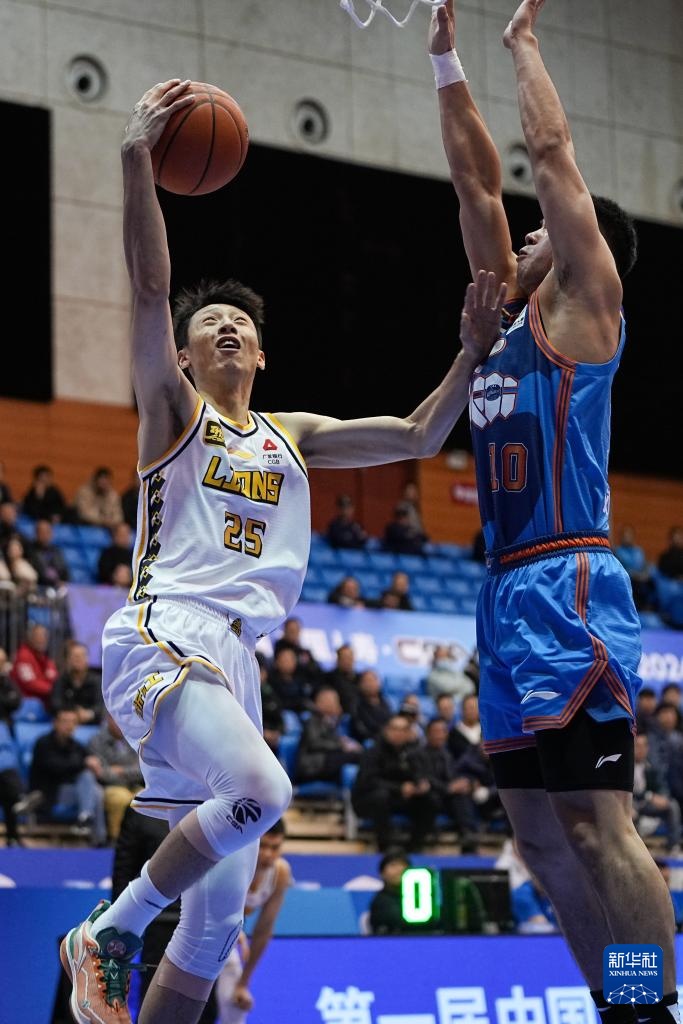 11月13日,浙江方興渡隊球員趙巖昊(左)在比賽中上籃。新華社記者 朱崢 攝