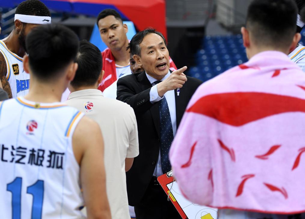 11月12日,北京隊主教練許利民(中)在比賽間隙向隊員布置戰(zhàn)術。新華社記者 李紫恒 攝