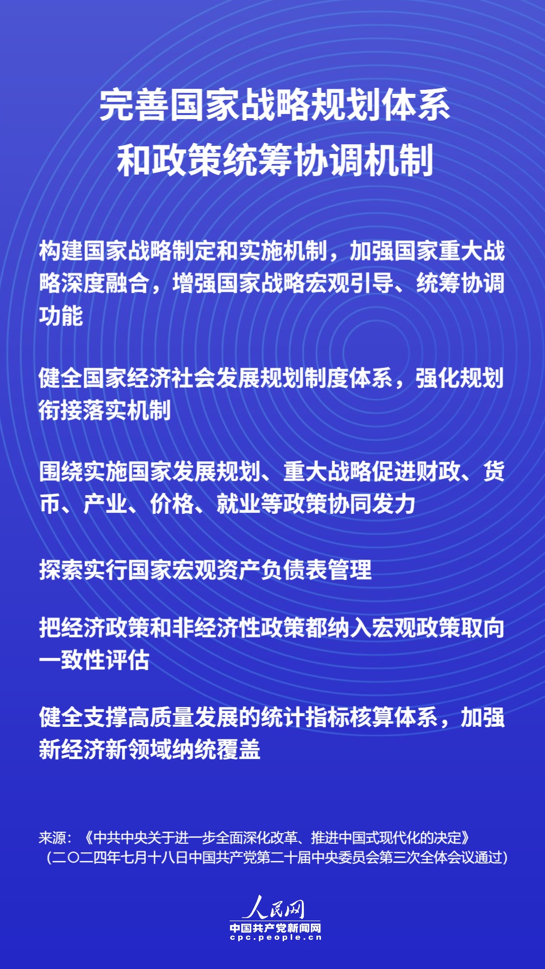 完善國(guó)家戰(zhàn)略規(guī)劃體系和政策統(tǒng)籌協(xié)調(diào)機(jī)制,要緊緊圍繞以中國(guó)式現(xiàn)代化全面推進(jìn)強(qiáng)國(guó)建設(shè)、民族復(fù)興偉業(yè)這一黨的中心任務(wù),突出高質(zhì)量發(fā)展目標(biāo)引領(lǐng),堅(jiān)持發(fā)揮戰(zhàn)略規(guī)劃導(dǎo)向作用,加強(qiáng)政策協(xié)調(diào)配合,保障戰(zhàn)略規(guī)劃落實(shí)。一是健全國(guó)家戰(zhàn)略深度融合推進(jìn)機(jī)制。構(gòu)建國(guó)家戰(zhàn)略制定和實(shí)施機(jī)制,加強(qiáng)國(guó)家重大戰(zhàn)略深度融合,增強(qiáng)國(guó)家戰(zhàn)略宏觀引導(dǎo)、統(tǒng)籌協(xié)調(diào)功能。二是健全國(guó)家戰(zhàn)略規(guī)劃銜接落實(shí)機(jī)制。強(qiáng)化國(guó)家發(fā)展規(guī)劃和國(guó)家戰(zhàn)略的有機(jī)銜接,強(qiáng)化專項(xiàng)規(guī)劃、區(qū)域規(guī)劃、空間規(guī)劃、地方規(guī)劃與國(guó)家發(fā)展規(guī)劃的有機(jī)銜接。發(fā)揮國(guó)家發(fā)展規(guī)劃戰(zhàn)略導(dǎo)向作用,強(qiáng)化空間規(guī)劃基礎(chǔ)作用,增強(qiáng)專項(xiàng)規(guī)劃和區(qū)域規(guī)劃實(shí)施支撐作用。健全戰(zhàn)略規(guī)劃推進(jìn)落實(shí)機(jī)制,細(xì)化落實(shí)政策體系,加強(qiáng)規(guī)劃實(shí)施評(píng)估,健全規(guī)劃動(dòng)態(tài)調(diào)整、修訂完善、監(jiān)督考核機(jī)制,強(qiáng)化重點(diǎn)任務(wù)落實(shí)。三是健全政策統(tǒng)籌協(xié)調(diào)機(jī)制。圍繞實(shí)施國(guó)家戰(zhàn)略和國(guó)家發(fā)展規(guī)劃,加強(qiáng)宏觀政策協(xié)調(diào)配合,增強(qiáng)宏觀政策取向一致性,將經(jīng)濟(jì)政策和非經(jīng)濟(jì)性政策都納入宏觀政策取向一致性評(píng)估,統(tǒng)籌把握好政策出臺(tái)時(shí)機(jī)、力度、節(jié)奏,強(qiáng)化各方面對(duì)政策的理解、執(zhí)行和傳導(dǎo),推進(jìn)財(cái)政、貨幣、產(chǎn)業(yè)、價(jià)格、就業(yè)、投資、消費(fèi)、環(huán)保等政策協(xié)同發(fā)力,最大限度調(diào)動(dòng)各方面積極性,形成政策合力。【全文】