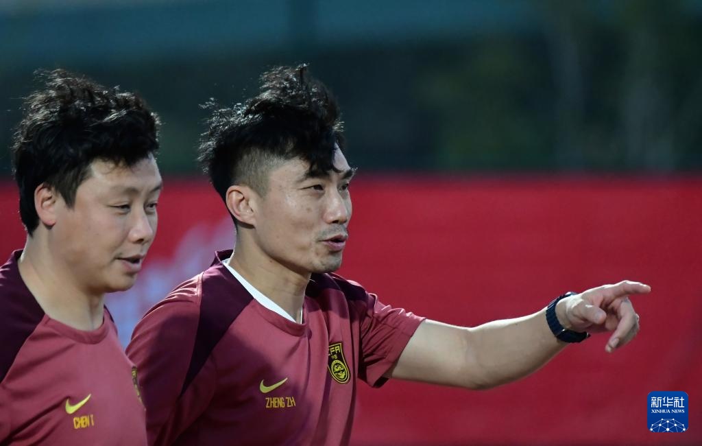 11月17日,中國隊助理教練鄭智(右)在訓練中。