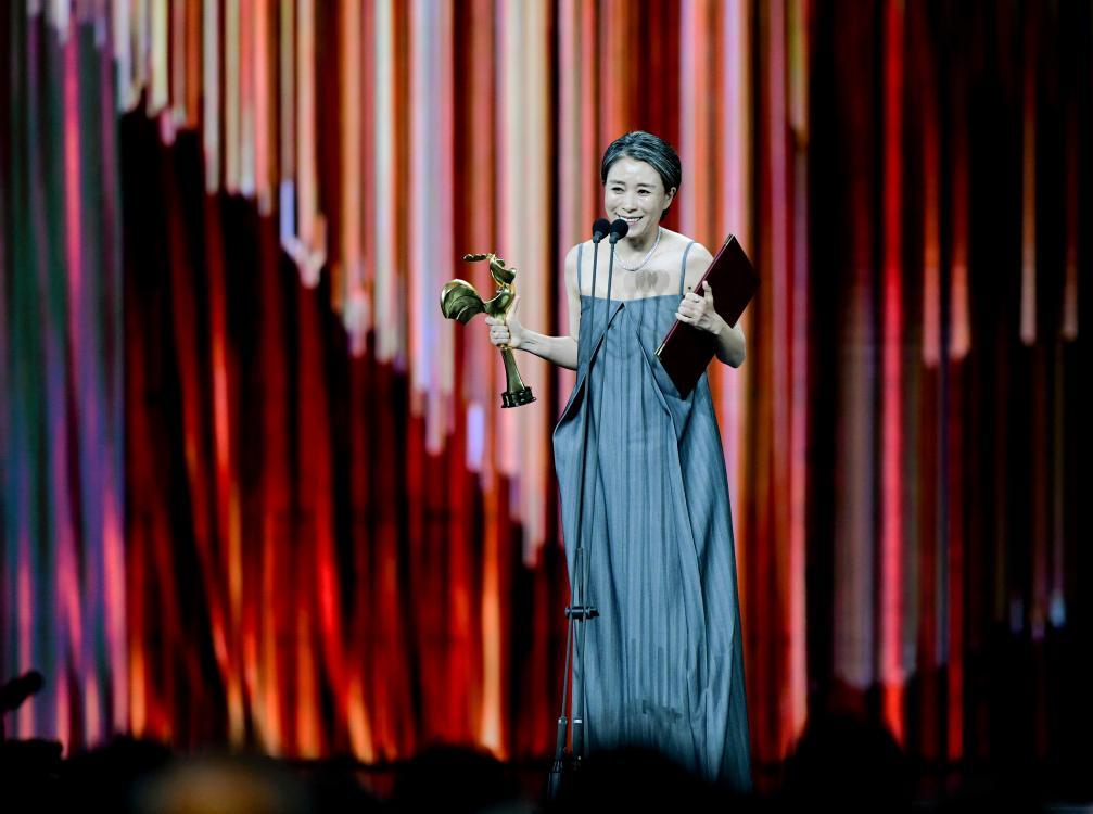 11月16日,劉丹在臺上領獎。劉丹憑借《乘船而去》獲得最佳女配角獎。新華社記者魏培全攝