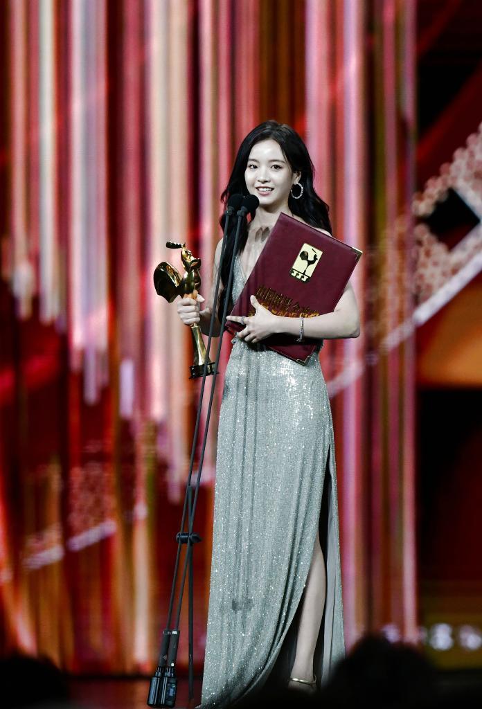 11月16日,李庚希在臺上領獎。李庚希獲最佳女主角獎。新華社記者魏培全攝