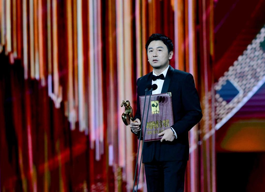 11月16日,王驍在臺上領獎。王驍憑借《三大隊》獲得最佳男配角獎。新華社記者魏培全攝