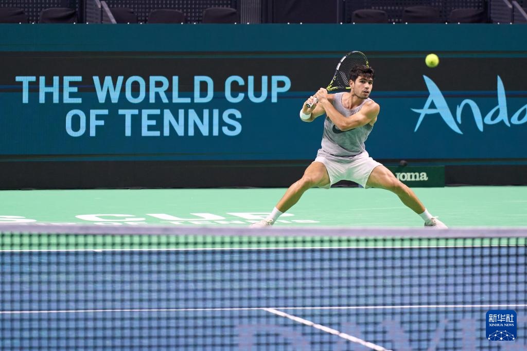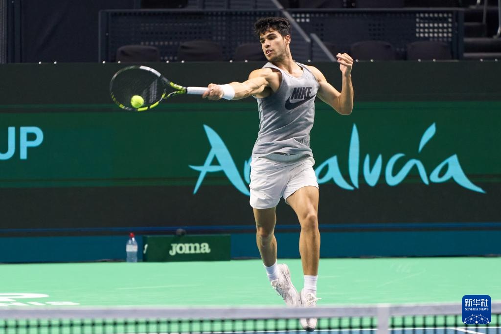 11月18日,西班牙選手阿爾卡拉斯在訓練中回球。
