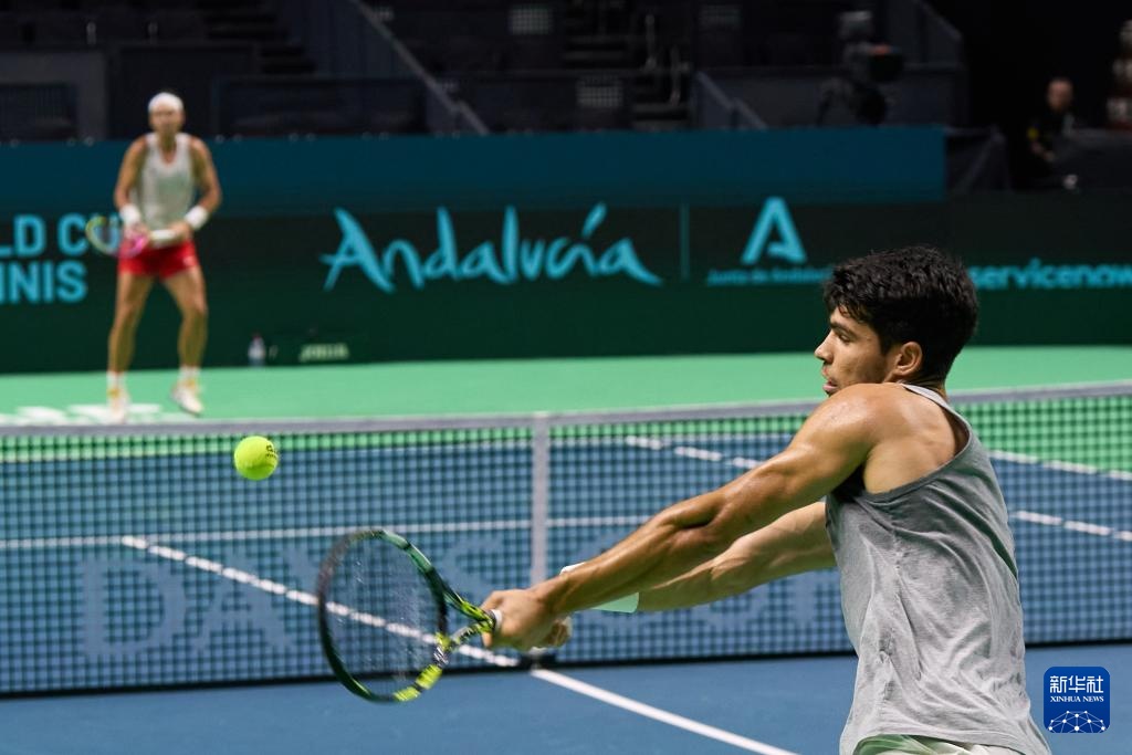 11月18日,西班牙選手阿爾卡拉斯(前)在訓練中回球。