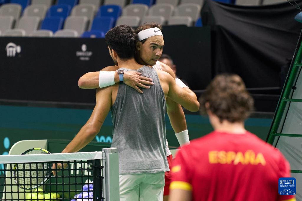 11月18日,西班牙選手納達爾(中)與阿爾卡拉斯(左)在訓練后擁抱。