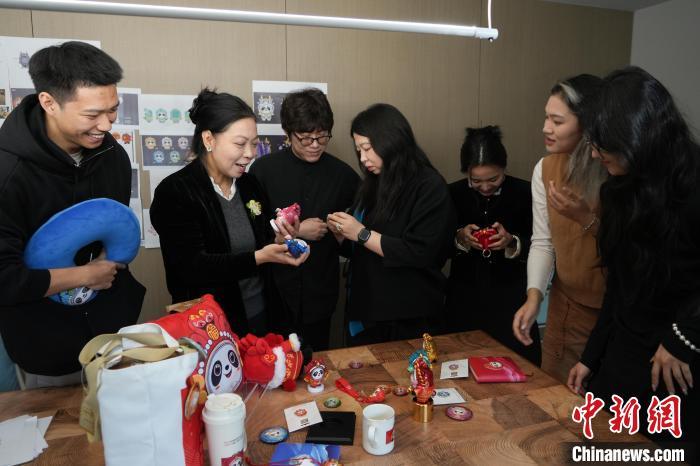 “蛇墩墩”主創設計師林存真(左二)在工作室與學生探討“蛇墩墩”設計理念。中新社記者 熊然 攝