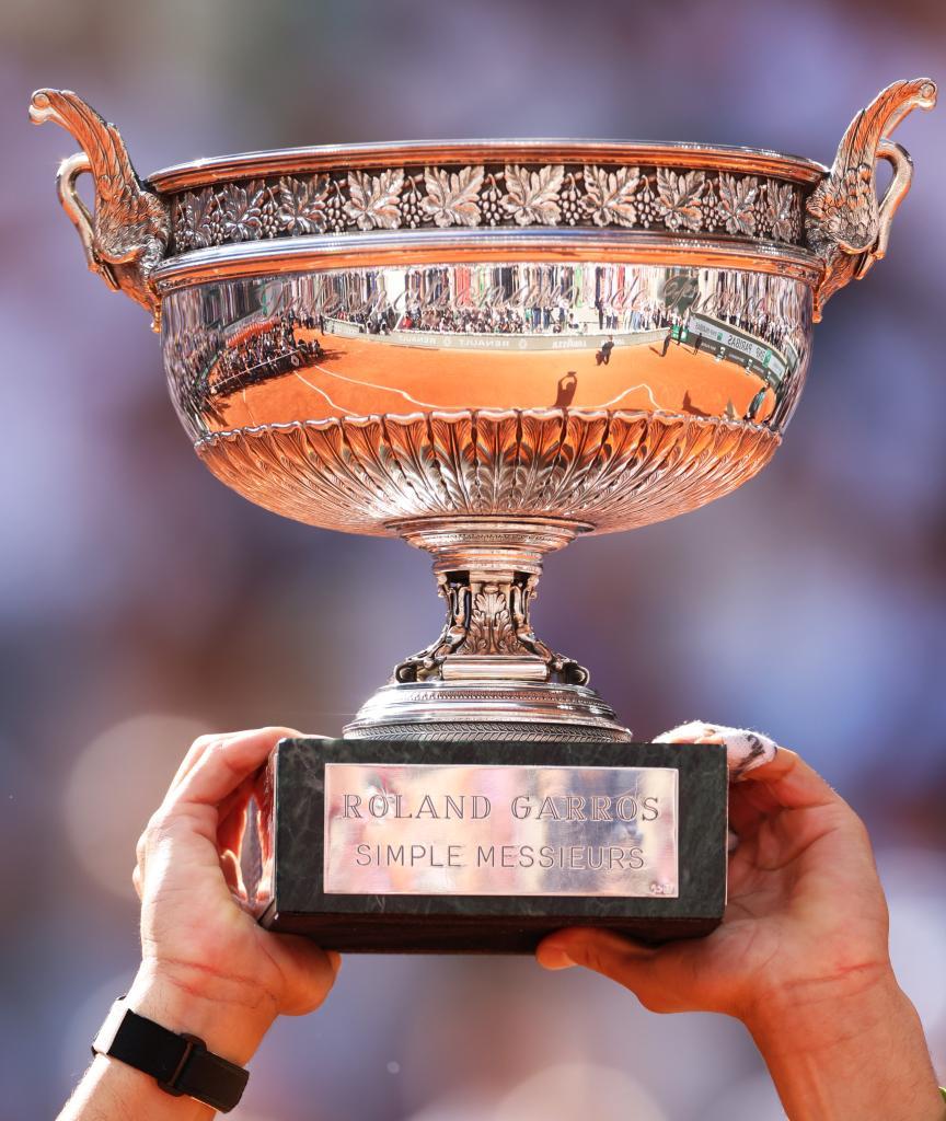 2022年6月5日,納達爾在頒獎儀式上舉起冠軍獎杯。在巴黎進行的2022法國網球公開賽男子單打決賽中,西班牙選手納達爾以3:0戰勝挪威選手魯德,獲得冠軍。新華社記者 高靜 攝