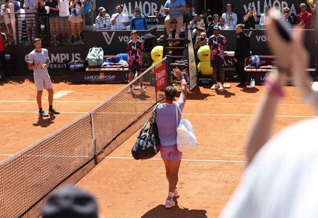 2024年5月11日,納達爾賽后向觀眾致意。當日,在ATP1000羅馬大師賽男子單打第二輪比賽中,西班牙選手納達爾0:2不敵波蘭選手胡爾卡奇,無緣晉級。新華社記者 李京 攝