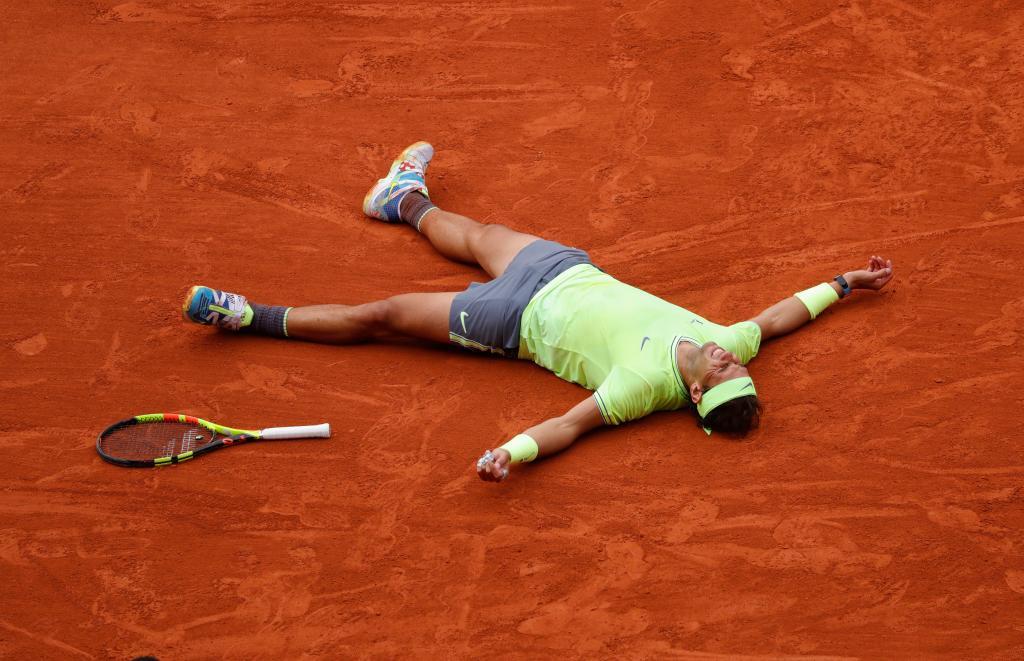 2019年6月9日,納達爾在法國網球公開賽男單決賽獲勝后倒地慶祝。新華社記者 韓巖 攝