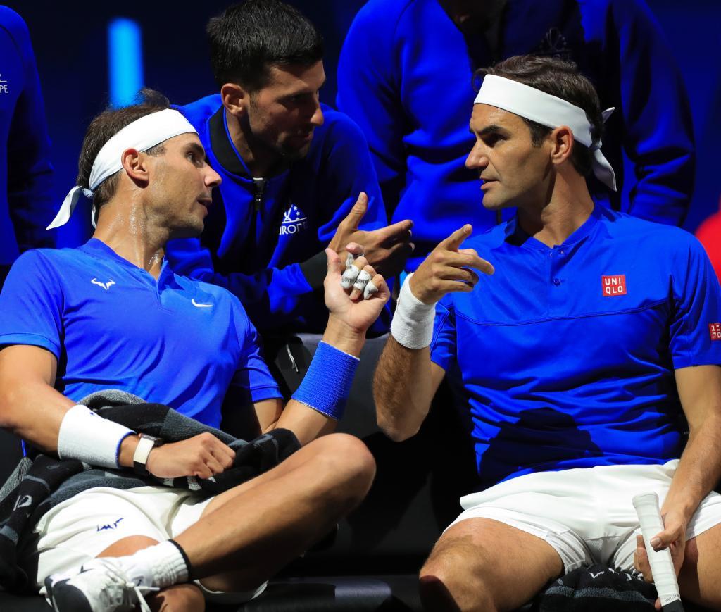2022年9月23日晚,在倫敦舉行的拉沃爾杯網球賽上,歐洲隊費德勒(前右)、納達爾(前左)與焦科維奇在比賽間隙交談。新華社記者 李穎 攝