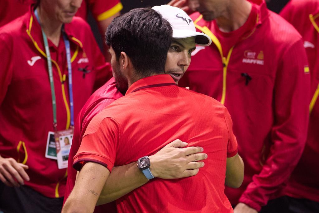 11月19日,西班牙隊選手納達爾(右)在比賽間隙擁抱隊友阿爾卡拉斯。新華社記者 孟鼎博 攝