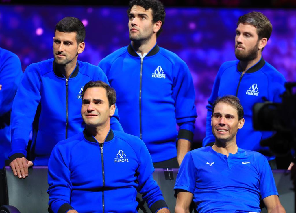 2022年9月24日凌晨,費德勒(前左)與納達爾(前右)在賽后告別儀式上落淚。9月23日晚,瑞士網球選手費德勒在倫敦舉行的拉沃爾杯網球賽上完成職業生涯最后一場比賽,正式退役。新華社記者 李穎 攝