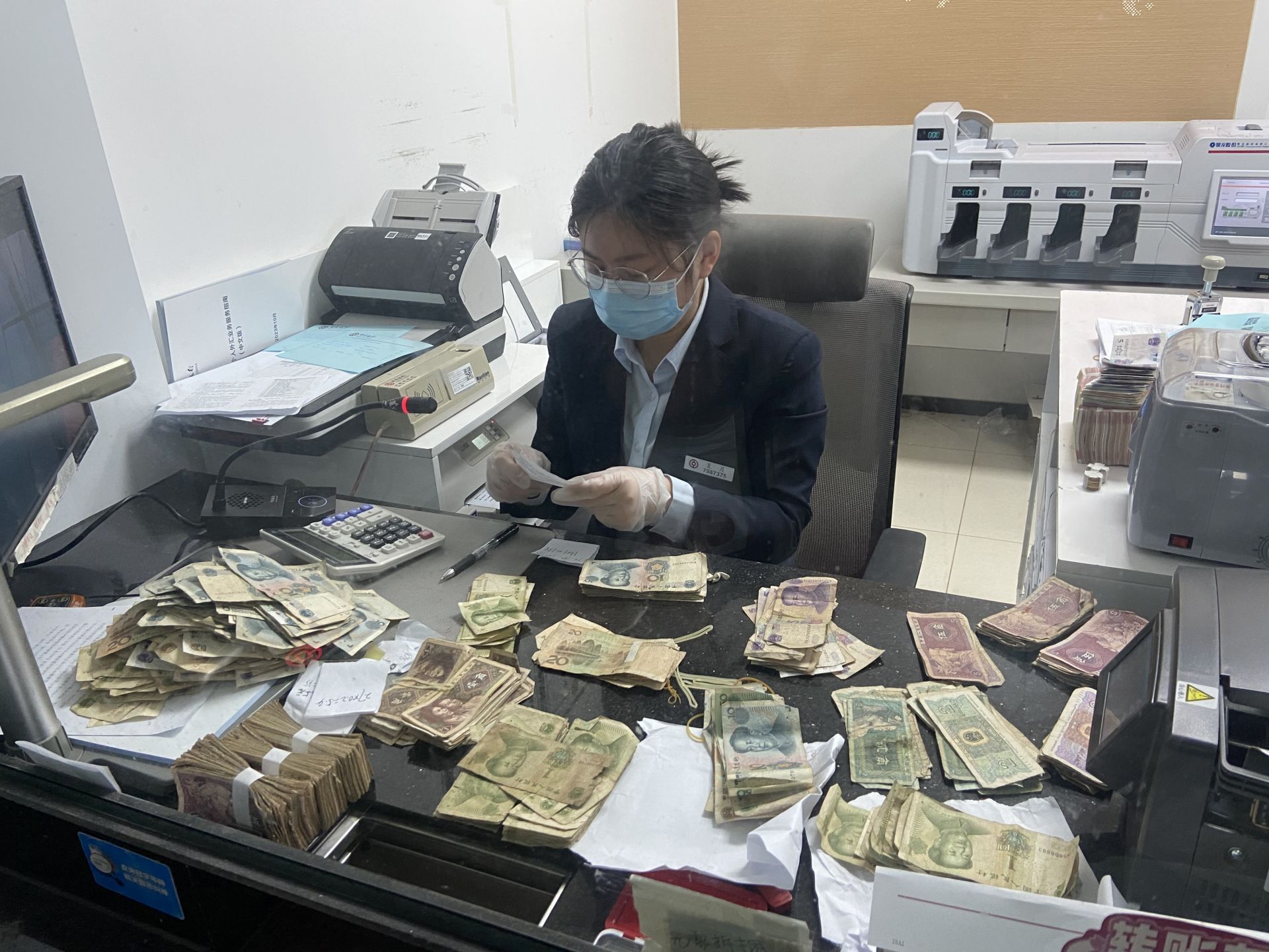 當天上午,一位年逾七旬的老人拄著拐杖走進營業大廳。由于行動不便,老人由家屬攙扶前來,手里拿著一沓積攢多年的零錢,希望銀行幫助他們兌換。大堂經理發現,有一部分是停止流通的第四套人民幣,分別為5角、2角、1角的紙幣,另一部分是10元、5元、1元的紙幣,大多受潮、破損嚴重,有的甚至粘連在一起,整個兌換過程需要較長的時間。