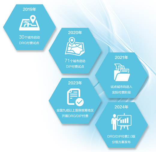 2019年,國家醫療保障局在武漢、湘潭等30個城市啟動按病組付費試點;次年,在廈門等71個城市啟動按病種分值付費試點。2021年,試點城市均進入實際付費階段。