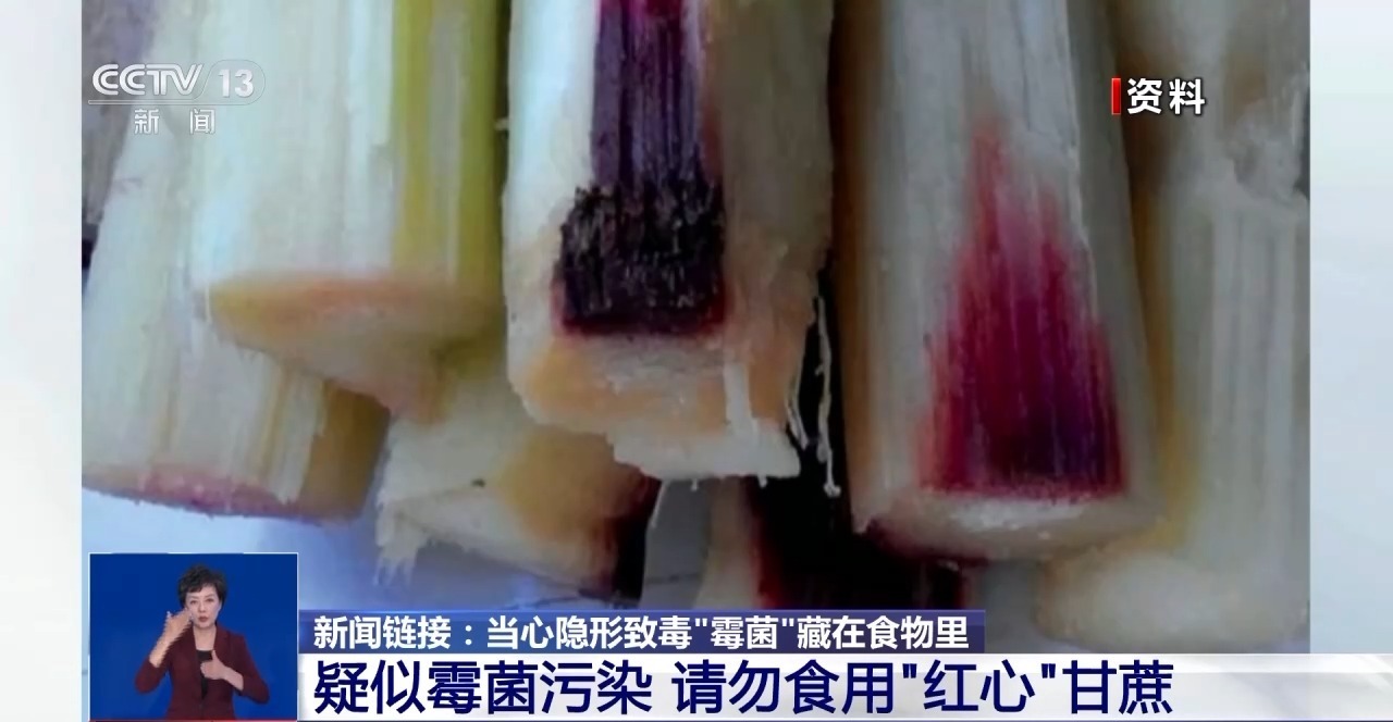 生活中有人常以為甘蔗內部變紅會變得更甜,其實甘蔗出現“紅心”“黑心”是因為其受到了霉菌污染。因為甘蔗的含糖量比較高、水分含量也十分充足,雖其果皮堅硬,但它在收獲時往往存在切口,果肉會暴露出來,所以易受儲存和運輸環境的影響,存在被霉菌污染的風險。其中——節菱孢霉菌堪稱危險的“殺手”,這種霉菌在生長繁殖過程中會產生一種劇毒的毒素——3-硝基丙酸。所以,提醒大家,請勿食用“紅心”甘蔗!