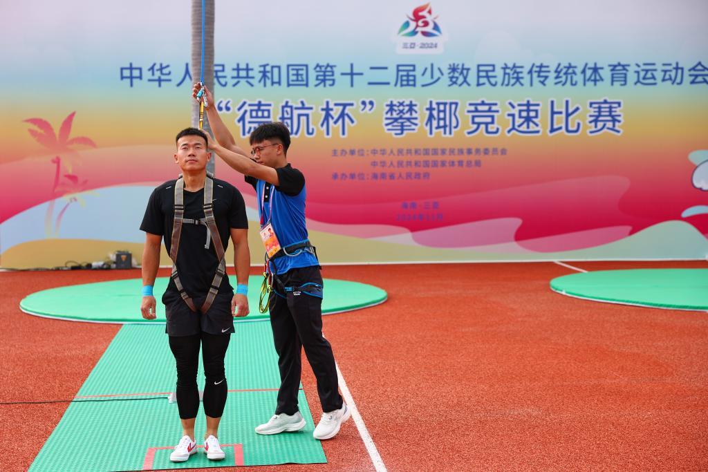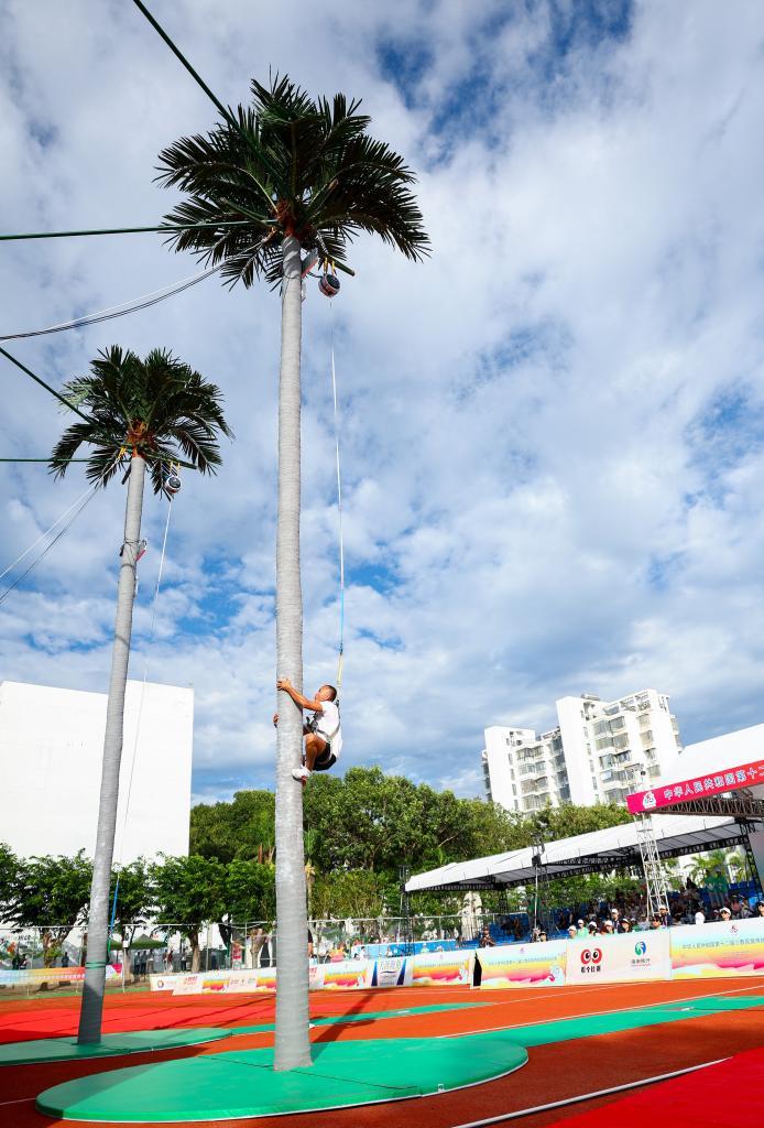 新華社三亞11月23日電(記者周慧敏、田光雨)你爬過樹嗎?你能想象爬樹也能成為比賽項目嗎?23日,作為第十二屆全國少數民族傳統體育運動會的新增競賽項目,攀椰競速比賽在三亞拉開帷幕,上演椰子樹上的“速度與激情”。