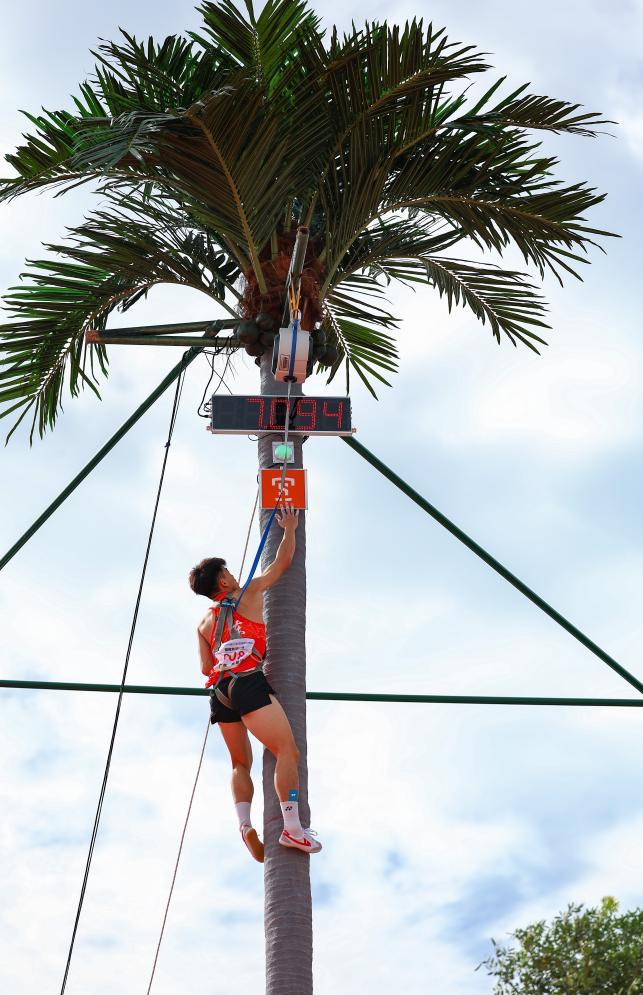 本次攀椰競速比賽配備統一的安全保護設備,要求運動員在9米(女子為7米)的人工制作的仿真椰子樹上進行攀爬,參賽選手自選攀爬姿勢,爬到椰子樹頂端并觸碰計時按鈴,用時最短者獲勝。