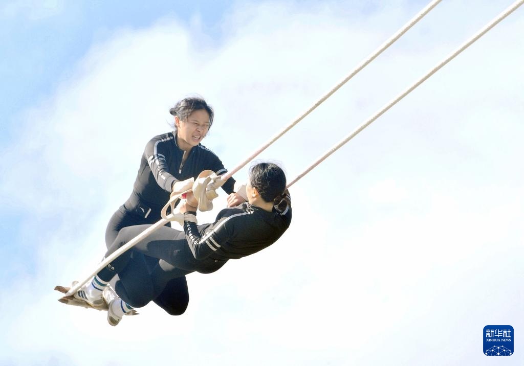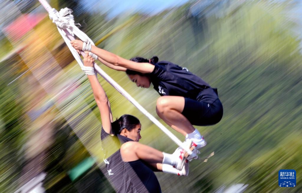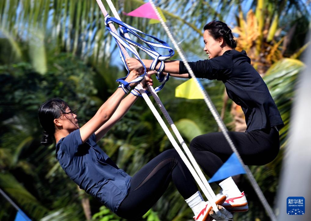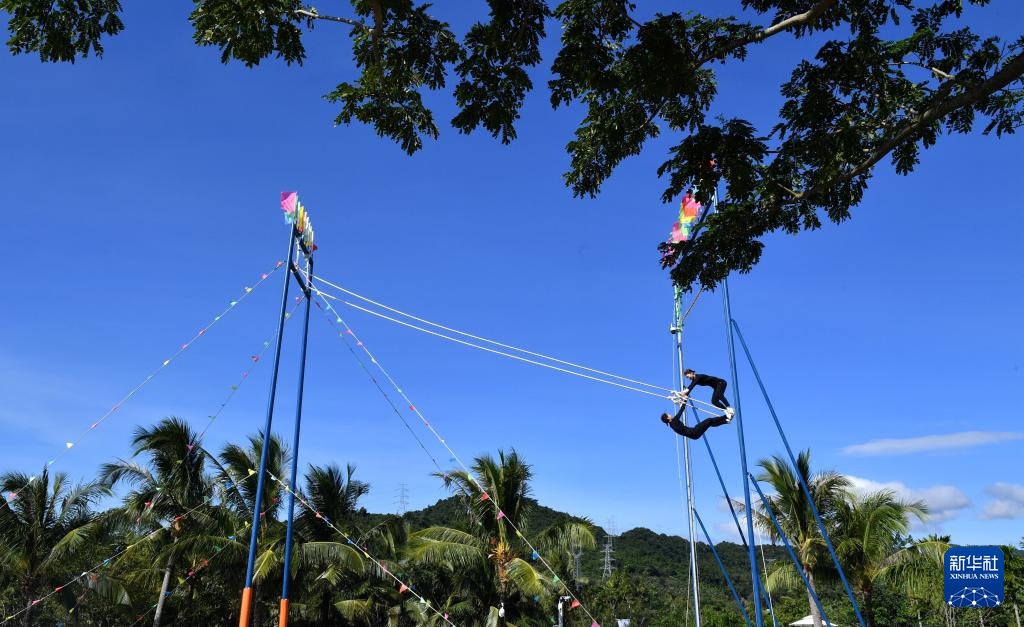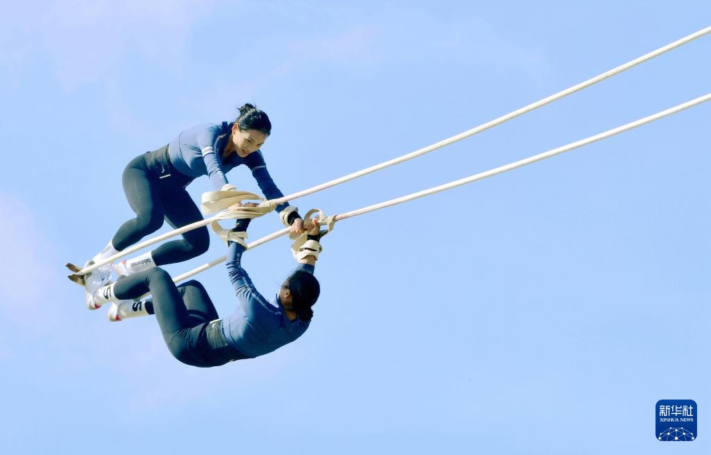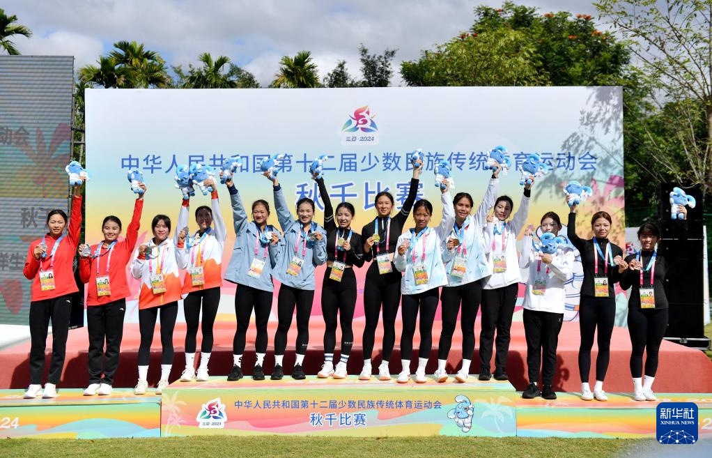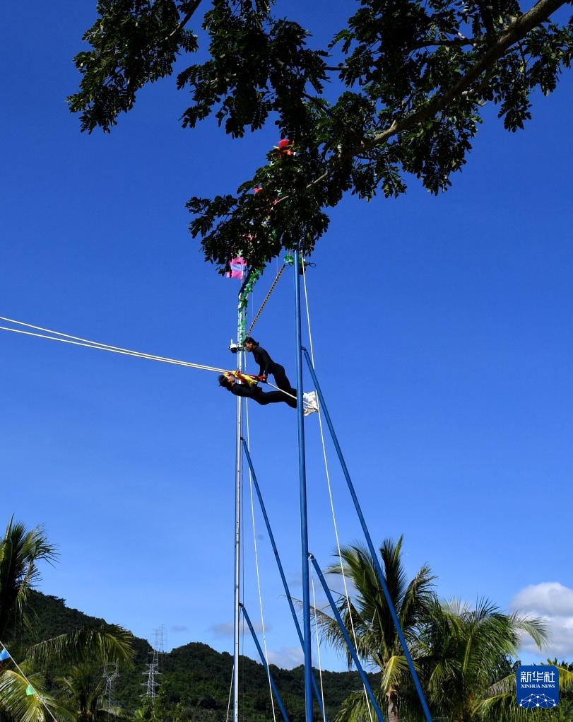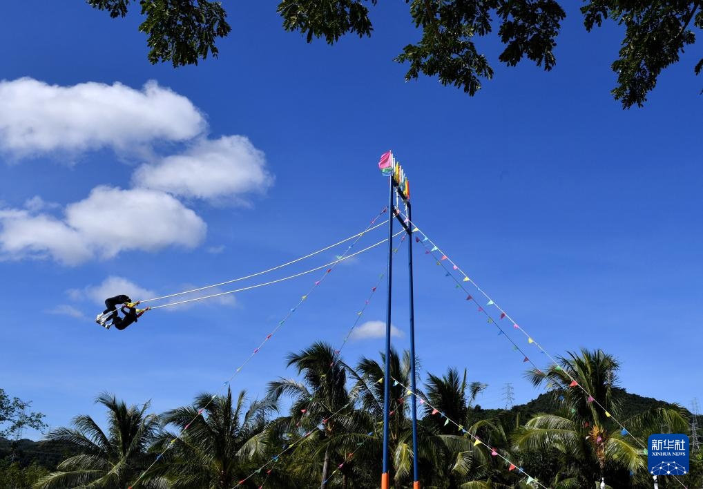 當日,第十二屆全國少數民族傳統體育運動會秋千項目55公斤雙人高度決賽在海南三亞大茅遠洋生態村舉行。