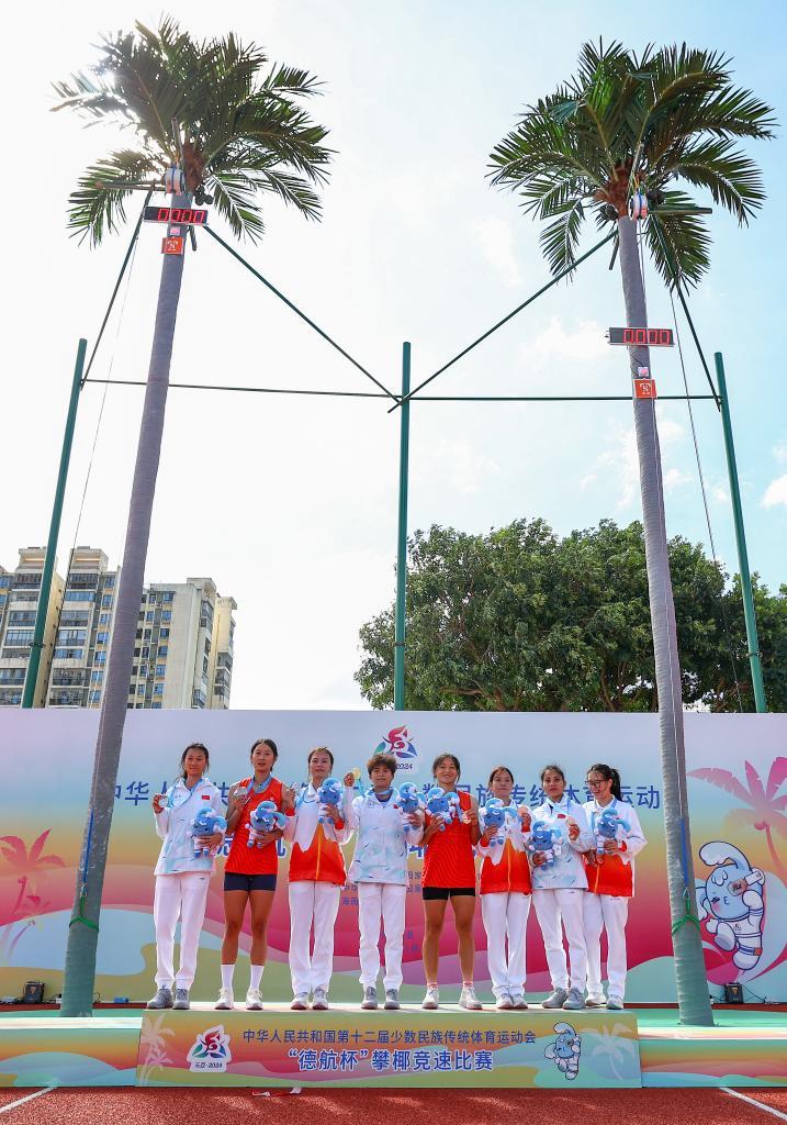 新華社三亞11月24日電(記者田光雨、周慧敏)24日,第十二屆全國少數民族傳統體育運動會攀椰競速比賽結束爭奪,海南隊的羅軍和符詩軍分獲男子、女子一等獎。