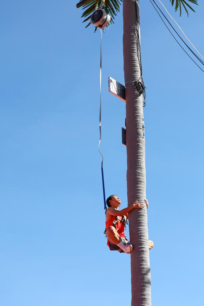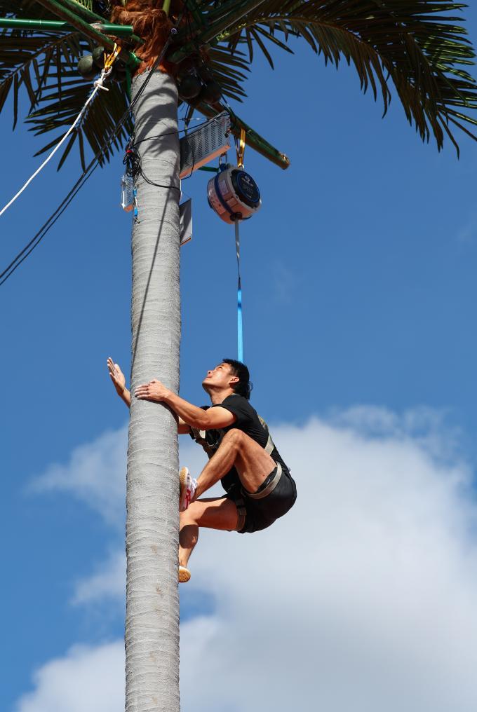 這項起源于海南群眾摘椰勞作的比賽既像沒有巖點的速度攀巖,又像垂直騰躍的跑酷。比賽中,運動員在9米(女子7米)的人造椰樹上攀爬,“樹干”筆直,六七秒之間便已決出勝負,扣人心弦的比賽令觀眾發出潮水般的歡呼。