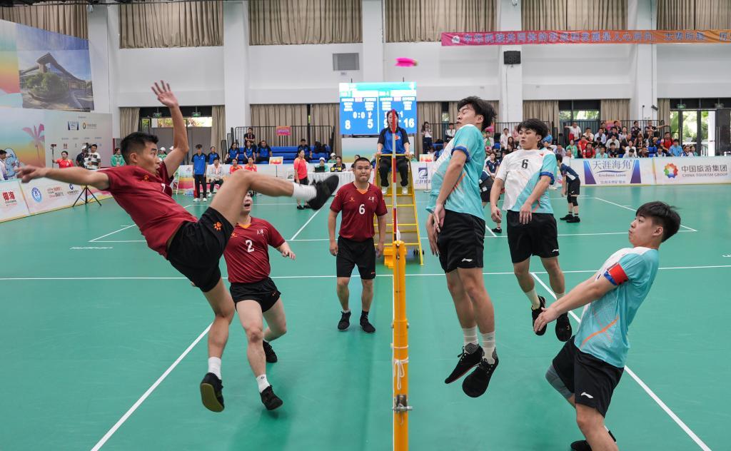 11月24日,第十二屆全國少數民族傳統體育運動會毽球男子三人小組賽在海南省三亞市舉行,圖為天津隊和廣西隊比賽現場。新華社記者 晉美多吉 攝