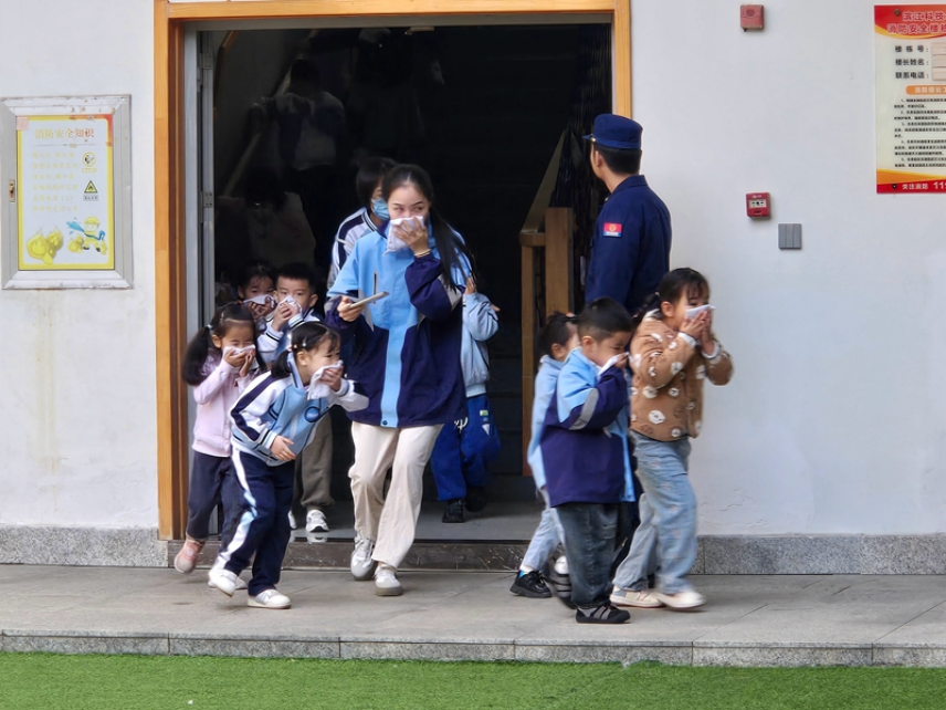 上午9點,隨著一陣急促的警報聲,幼兒園全體師生彎腰低姿勢、捂住口鼻,沿疏散樓梯快速有序撤離“火災現(xiàn)場”,抵達室外的安全區(qū)域。隨后,消防宣傳員以模擬示范、活動體驗等形式,為師生們普及了生活中的消防安全常識,指導學生和老師們進行了滅火器滅火實操演練。