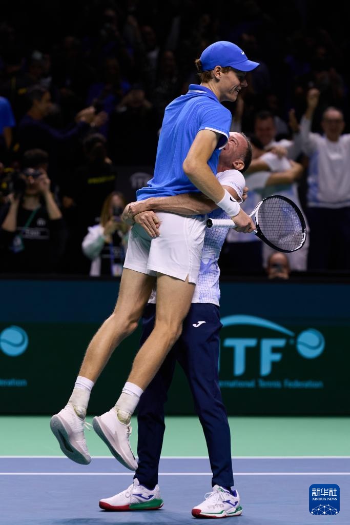 11月24日,意大利隊選手辛納(上)和教練慶祝勝利,他2比0戰勝荷蘭隊選手塔隆·格里克斯普爾。