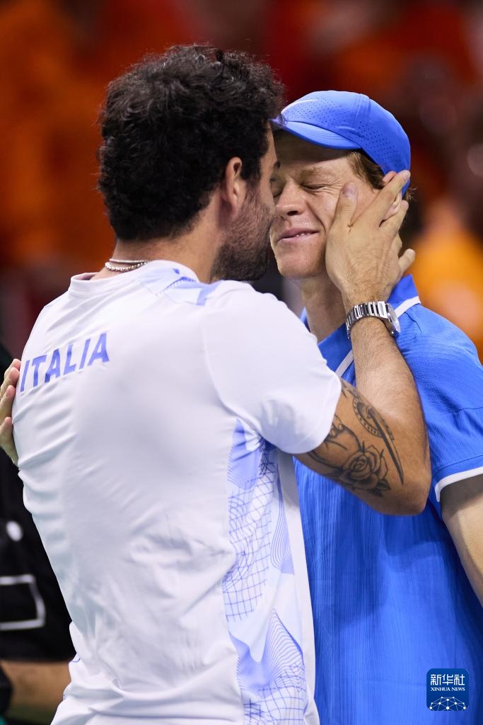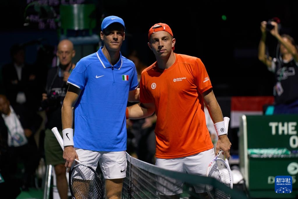 11月24日,意大利隊選手辛納(左)與荷蘭隊選手塔隆·格里克斯普爾在比賽前合影。最終,辛納2比0戰勝塔隆·格里克斯普爾。
