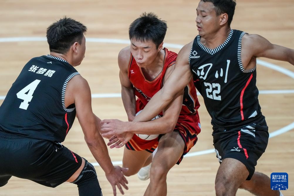 11月25日,四川隊(duì)選手蔡科(右)、張夢(mèng)騰(左)在比賽中防守云南隊(duì)選手嚴(yán)俊杰。