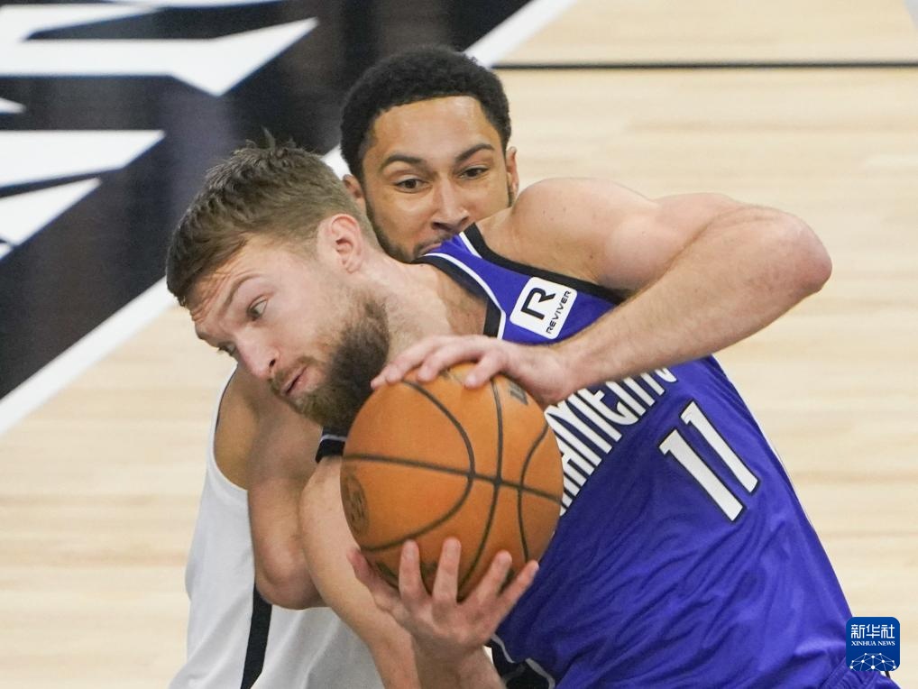 11月24日,國王隊球員薩博尼斯(前)與籃網隊球員西蒙斯在比賽中拼搶。