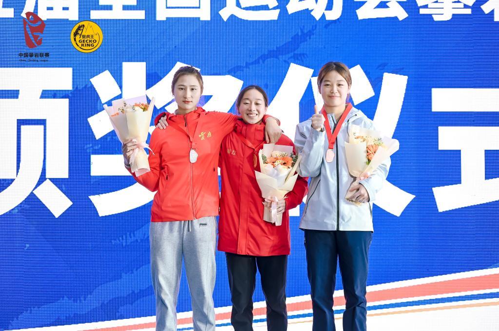 周婭菲(中)、汪生艷(左)和黃欣怡在女子速度項目的頒獎儀式上